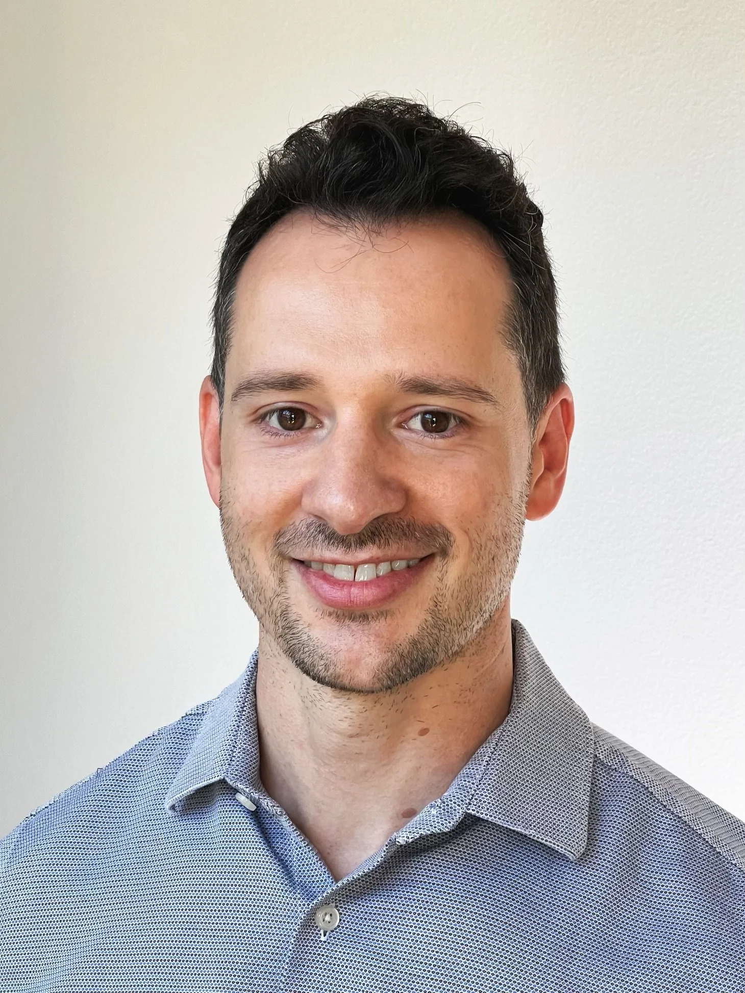 A man with dark hair wearing a light-colored collared shirt, smiling, against a plain background.